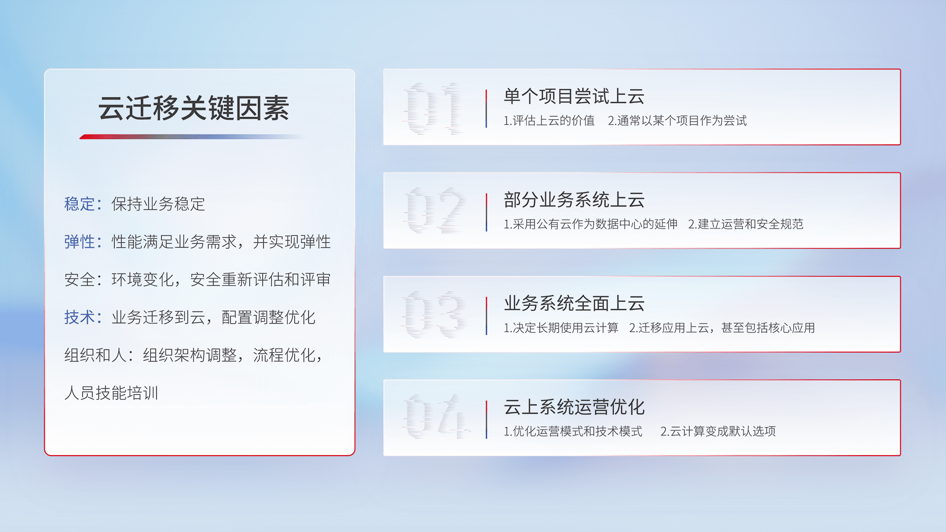 结合实际业务,,,从规划设计、、、、云平台选型、、、、云原生改造、、、数据迁移、、、、集成交付,,,,迁移全过程为客户识别最佳上云路径,,,,做好风险识别管理,,,,设计网络架构、、、、身份权限、、、、安全审计合规、、操作审计、、、日志审计、、监控告警策略、、、多站点容灾设计等,,对云上基础设施进行整体规划,,提升IT治理水平,,以满足弹性、、高可用、、、、高性能的需求。。