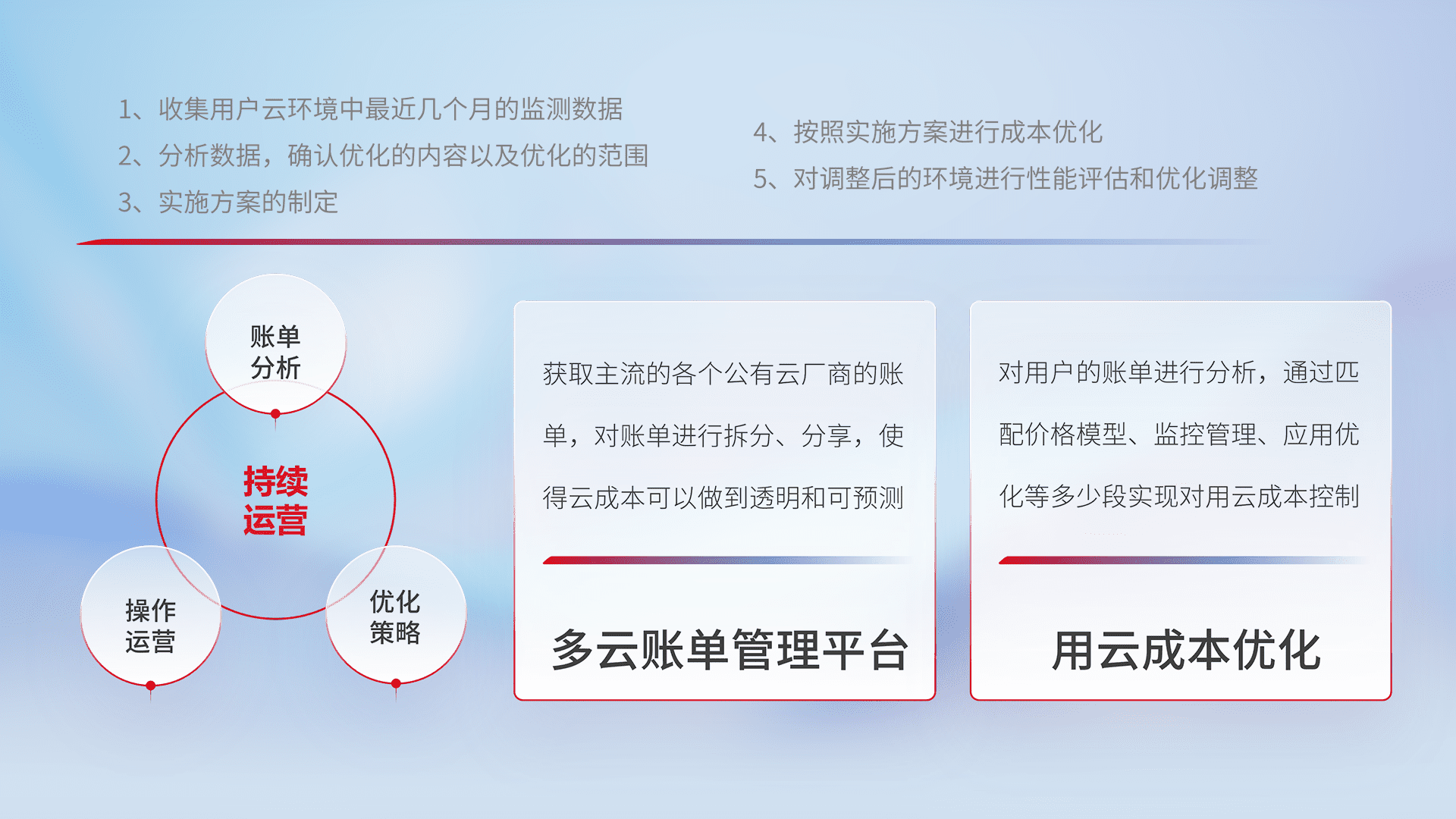 通过多云纳管,,,,以统一的资源数据模型把客户的云资源进行抽象和封装,,进而实现对多云资源的统一操作,,,,保障云资源管理的可靠性、、、、稳定性与可用性。。。量身定制化运维内容,,配置、、开发运维、、补丁管理、、、、备份、、、监控、、、认证和访问管理、、审计和日常巡检等,,,,保障在用云过程中的可靠度,,,稳定度以及高可用率。。。。