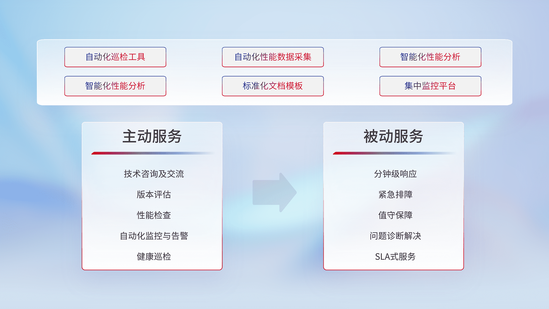 智能化工具和标准化文档,,,,保障服务质量,,,提供主动服务(包含技术咨询、、、、版本评估、、、、性能检查、、、自动化监控与告警、、健康巡检)和被动服务包含(分钟级响应、、、紧急排障、、值守保障、、问题诊断解决、、SLA服务)。。。