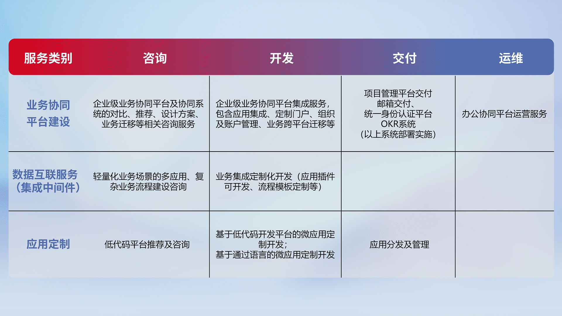针对钉钉、、企微、、、、IDaas等平台级产品提供产品的规划、、、、方案、、交付、、定制化开发等服务,,,实现如统一协同办公、、智能客户服务、、、、混合会议管理、、、、智能数据查询、、、等业务场景,,,,实现数字化转型。。。。